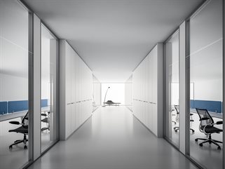 Parete Divisoria da 10 cm con struttura in acciaio, è predisposta per essere rivestita con coppie di pannelli contrapposti in melaminico o vetro. In evidenza la flessibilità compositiva e la solidità delle diverse tipologie di moduli previsti, che comprendono anche le porte battenti e moduli vari. Possibile integrazione con la parete attrezzata.